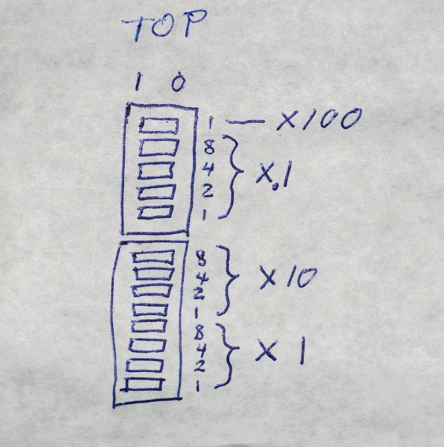 This view shows two resistors and a capacitor all tied together which is the output from the phase lock loop and should be between 0 and 5 volts. When operating normally and the PLL is locked it should stay half way between, at 2.5 volts. If it's 0 or 5 volts then the resonator coil and capacitor are not tuned close enough to the desired frequency.